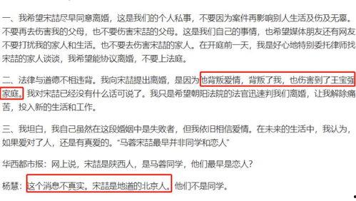 面对杨慧的爆料,马蓉并没有选择沉默,而是迅速做出了回应。她在微博上发文称,自己与王宝强的婚姻早已名存实亡,出轨行为并非她主动,而是被逼无奈。她还表示,自己愿意接受法律的制裁,为自己的行为负责。